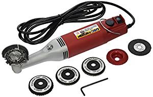 The lMerlin2 has been completely re-engineered inside and out, and now includes 6 great accessories including coarse, medium and fine sanders. Merlin2 utilizes spiral gears to work harder, operate more quietly and produce less vibration than the previous model. Safety improvements include a one-piece cast aluminum safety guard that is both safer and more durable, a switch guard to reduce accidental starting, and more resilient materials less susceptible to damage. The exterior includes a textured neck for better grip and an ergonomic design for comfort with less hand, arm and wrist fatigue during use. The interior includes a new motor that powers effortlessly between 0 - 13,000RPM's with improved efficiency and can be powered by an automobiles AC/DC power converter. A new high-capacity fan and extra air vents on both the neck and bottom allow the new model to stay cooler and work longer. Merlin2s new circuit board and electrical components are made from eco-friendly materials and are RoHS compliant. Pulling only one amp of power, the tool is also energy efficient. Complete kit contains one variable-speed Grinder and one each of the following accessories: coarse Carbide Disc, 60-, 120-, and 240-grit Flap Discs, fiberglass Cut off wheel